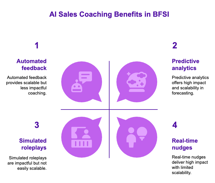 AI sales coaching is the use of machine learning, NLP, and behavioral analytics to deliver tailored coaching to sales professionals. In BFSI, this means: